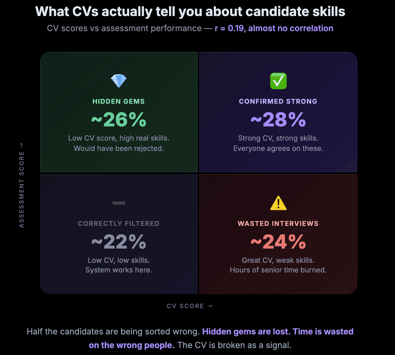 candidates with a "weak" CV actually outperform their peers on real technical skills. Hidden gems, people with the talent but not the pedigree, getting filtered out before anyone even looks at them.