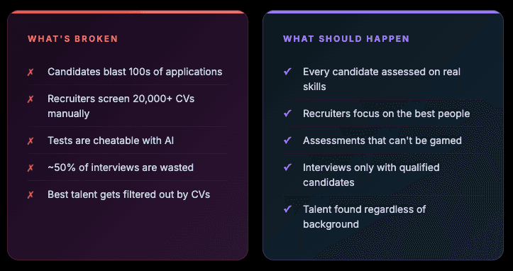 This isn't just an efficiency problem. It's a fairness problem. When you screen 20,000 applications with a CV filter and a cheatable test, you're not finding the best people. You're finding the best CVs.